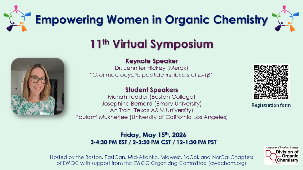 The Boston, EastCan, Mid-Atlantic, Midwest, SoCal, and NorCal Chapters of Empowering Women in Organic Chemistry (EWOC), with support from the EWOC Organizing Committee, are hosting a joint virtual symposium on Friday, May 15th, 2026 from 3-4.30 PM EST, 2-3.30 PM CST, 12-1.30 PM PST featuring a keynote from Dr. Jennifer Hickey (Merck). Student speakers will include Mariah Tedder (Boston College), Josephine Bernard (Emory University), An Tran (Texas A&M University) and Poulami Mukherjee (University of California Los Angeles). Interested? Register here!