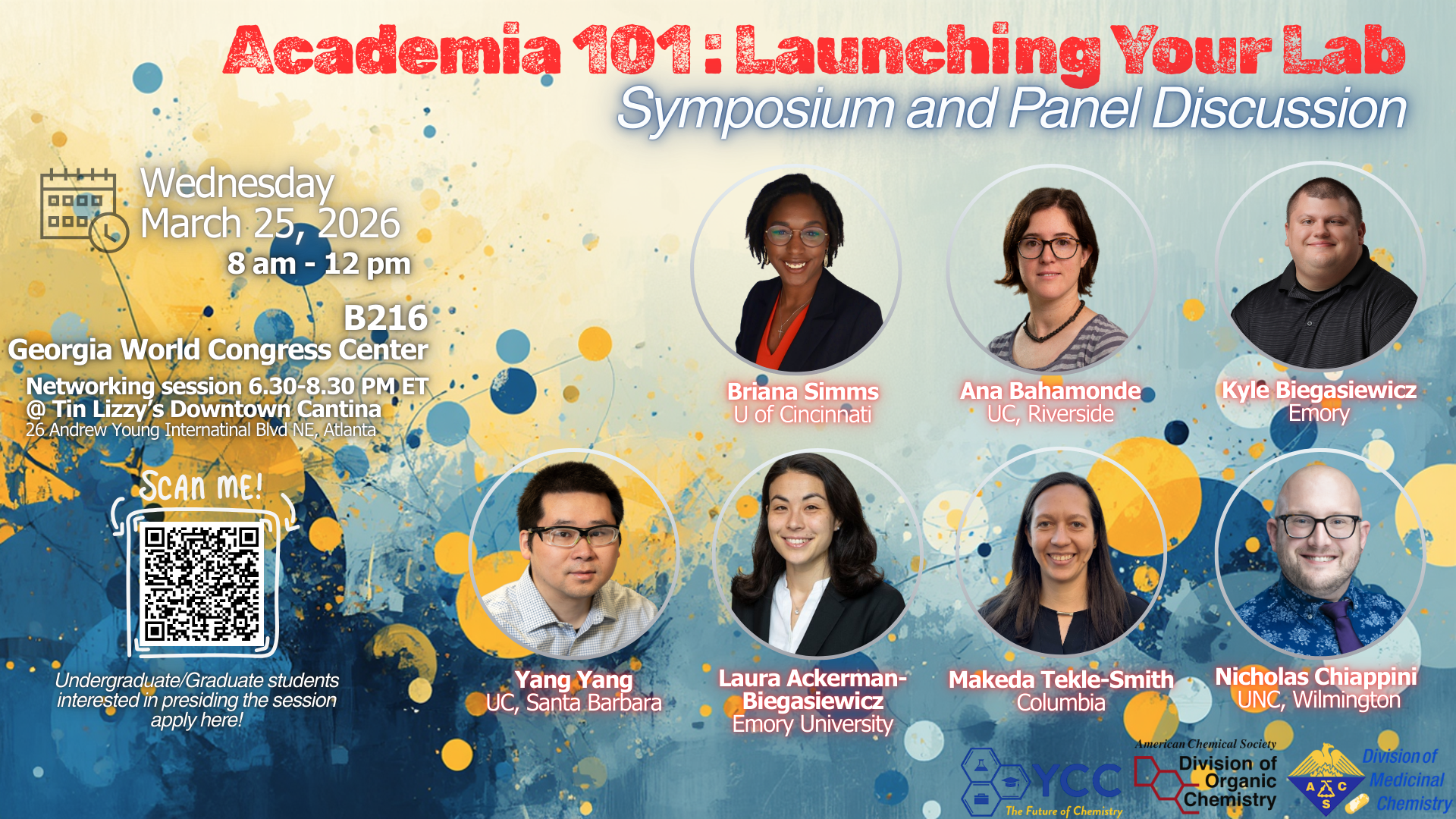 In addition, the Division of Organic Chemistry and the Younger Chemists Committee are also co-hosting a new symposium, “Academia 101: Launching Your Lab” at upcoming Spring ACS meeting in Atlanta! This half-day symposium will take place on Wednesday, March 25 from 8 am to 12 pm and features an exciting line-up of early-career academic professionals.
