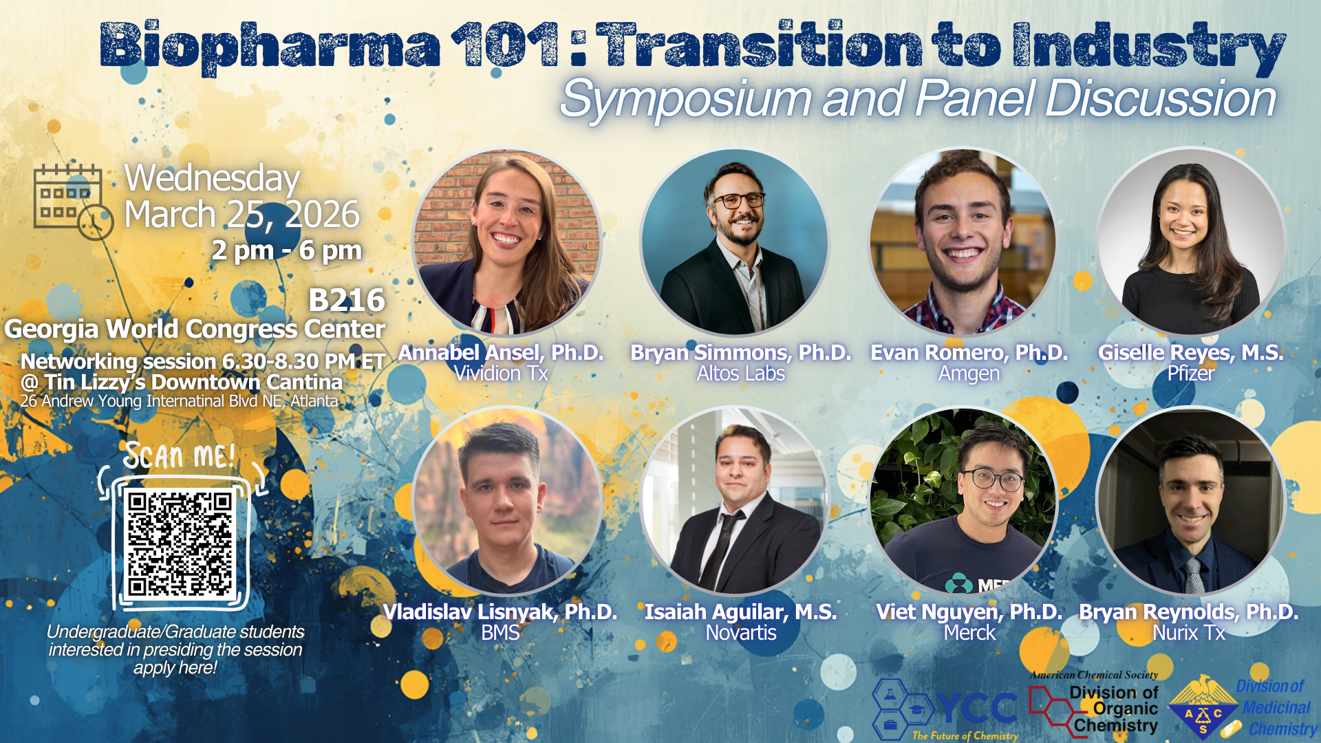 The Division of Organic Chemistry, the Division of Medicinal Chemistry, and the Younger Chemists Committee are excited to be co-hosting “Biopharma 101: Transition to Industry” at the upcoming ACS meeting in Atlanta this Spring! In its third year, this half-day symposium will take place on Wednesday, March 25 from 2-6 pm and features an exciting line-up of early-career pharmaceutical professionals.